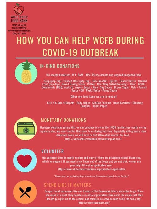 Julianna Carlson read an email about how the demand for food assistance is rising at an extraordinary rate, just as our local food banks are being struck by shortages of donated food. An idea began to form – a food drive to support the White Center Food Bank!
