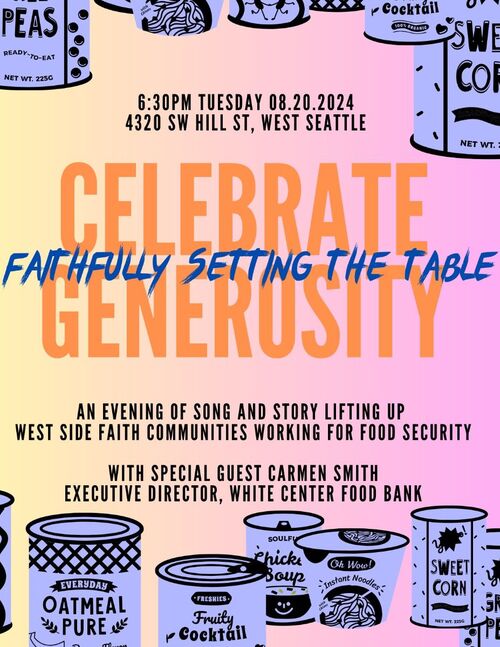 WIN is having an event on Tuesday, August 20 - “Faithfully Setting the Table to celebrate generosity of the community." Join fellow food security advocates for an evening of song and story at Admiral congregational UCC. Guest will be Carmen Smith executive Director of the White Center Food Bank.